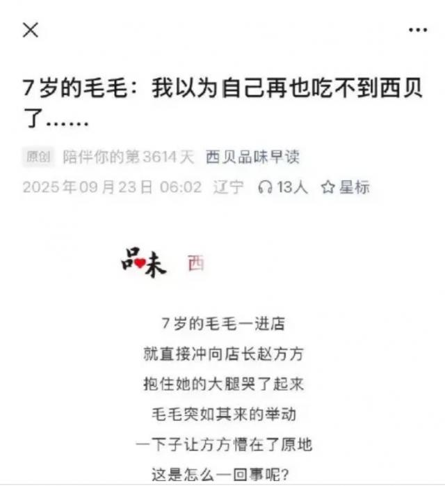 9 月 23 日,西贝公众号发布文章《7 岁的毛毛:我以为自己再也吃不到西贝了》。其中提到,毛毛从 2 岁起开始吃西贝,妈妈因为最近的新闻不让毛毛光顾西贝,毛毛哭着、闹着,哪怕妈妈用玩具"诱惑",也要遵守与西贝的"约定"。