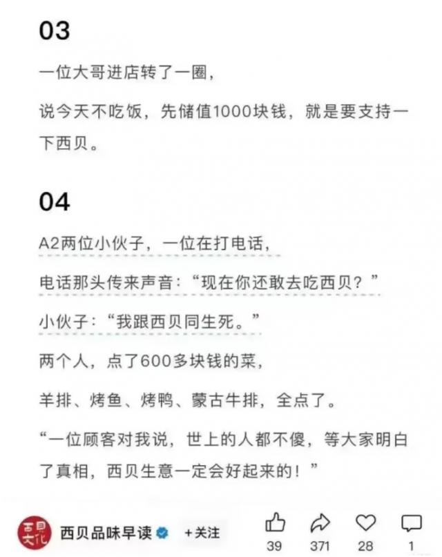 另外,西贝发布的相关文章中还讲述了"大哥进店不吃饭,先储值 1000 块钱支持西贝""小伙子两个人点 600 多块钱的菜,说‘我跟西贝同生死’"等情感故事。