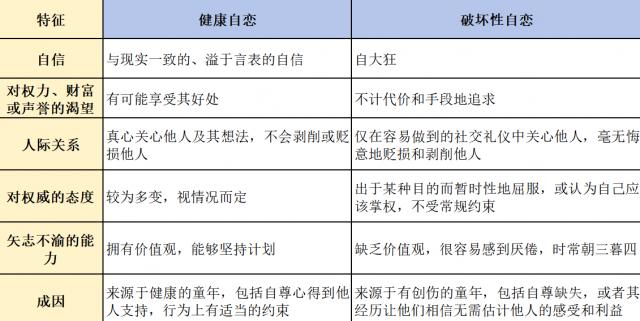 但也要提醒大家的是,我们每个人其实都存在一定程度的自恋倾向,而且大部分人拥有的都是一种健康自恋(Healthy narcissism),会让个体表现一种稳固且真实的自信,能够有韧性地面对挫折和批评,并与周围的人建立良好的人际关系。只有超出正常范围,对工作、生活和人际关系造成严重影响的自恋,才是一种破坏性自恋( Destructive narcissism)。