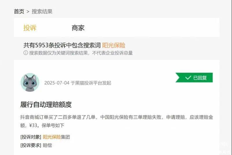 与此同时,2025年一季度公司核心业务板块表现分化明显。消费者满意度方面亮起“红灯”,黑猫投诉平台显示,涉及“阳光保险”的投诉量高达5954条,其中阳光财险、阳光人寿相关投诉分别为939条和701条。