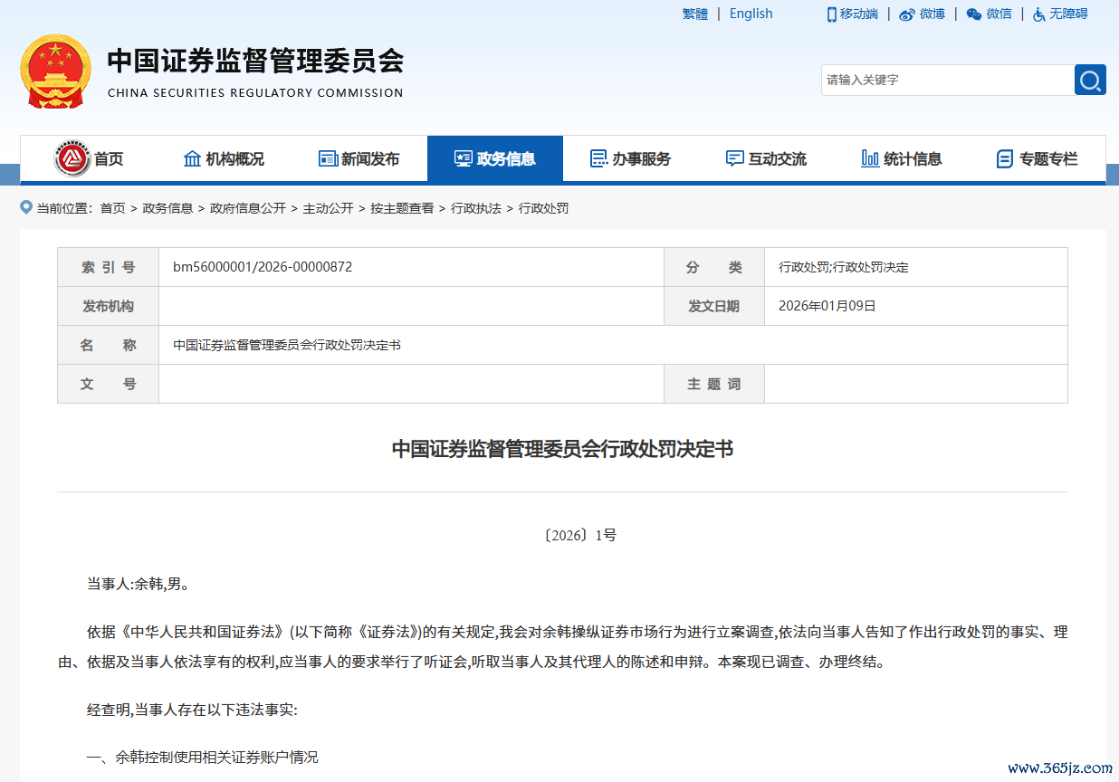 1月23日,证监会官网披露的“〔2026〕1号”行政处罚决定书显示,对余韩控制使用67个证券账户操纵证券市场行为作出处罚,没收违法所得5.1亿元,并处以同等金额罚款,罚没金额共计10.2亿元。